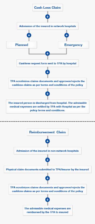 If you wish to opt for Cashless Treatment in a network hospital, you must contact the TPA (Third Party Administrator) help desk at the time of hospital admission. A claim form along with doctor’s reports has to be submitted to seek approval for the cashless treatment. If the request is approved, the insurance company/TPA settles the bills for the expenses directly with the hospital without involving the policy holder. This is the most convenient method of claiming on your mediclaim policy.